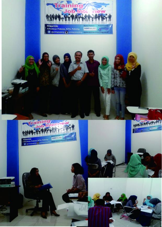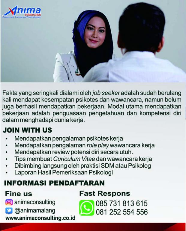 BIRO PSIKOLOGI ANIMA MENYELENGGARAKAN JOB INTERVIEW TRAINING Faktor penting dalam sebuah proses rekrutmen adalah asesmen yang valid. Salah satu asesmen yang seringkali digunakan para HRD dalam merekrut karyawan selain dengan psikotest adalah melalui wawancara. Pada praktiknya, tidak mudah untuk menggali data dengan wawancara. Hal inilah yang menjadi dasar terselenggaranya training sehingga pada